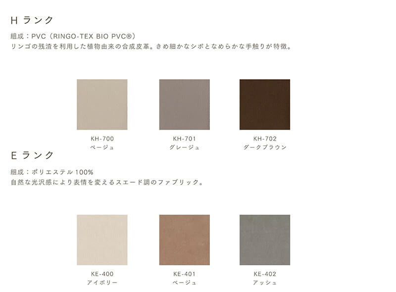 HランクのPCVはRINGO-TEX BIO PVC®と呼ばれるリンゴの残渣を利用した植物由来の合成皮革です。