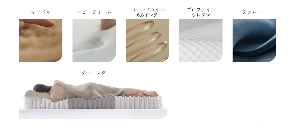 ゴールドコイルを採用したポケットコイルは、肩口にあたる部分(ホワイト)、身体の荷重が集中する腰部(グレー)の巻数を変えて、固さ加減を調整しています。
