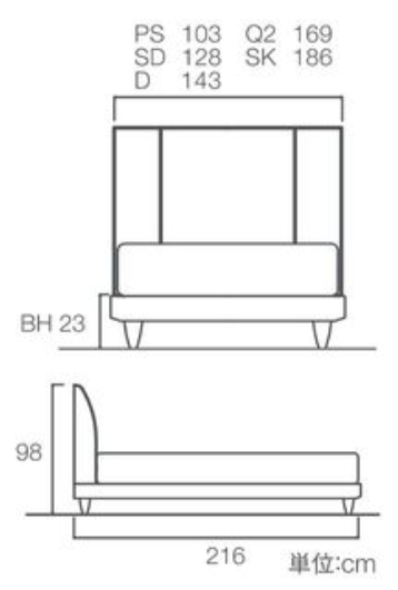 全体的に非常にスリムでしなやかな外観で、サイドフットの直線ラインの美しさが際立ったモデルです。ヘッドボードが浮いているように見えるので、スリムなサイドフットと相まって、漂っているような軽さを感じさせます。