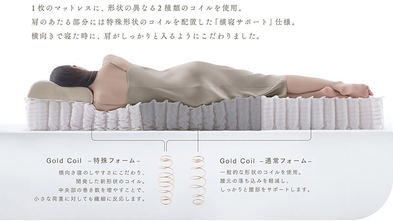 肩部には形状と巻き数を最適化した新型コイル、Gold Coil - 特殊フォーム - を配し、横向き寝でも理想の寝姿勢を実現しています。